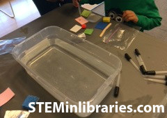 - Absorb or Repel Station: Using inspiration from Not Just Cute and PreKinders, we cut up materials like dish sponges, microfiber cloth, aluminum foil, tissue paper, craft sticks, and wax paper and separated them into a baggie for each child. We also had a small pot of dirt available that they could drop water into to see if dirt absorbs or repels water. Children used eyedroppers to pull water from a container of water on the table. Parents did awesome at this station, using the words “absorb” and “repel” from our instructional sign to have their children make predictions and observations. Be sure to have paper towels at the ready—water will get everywhere!