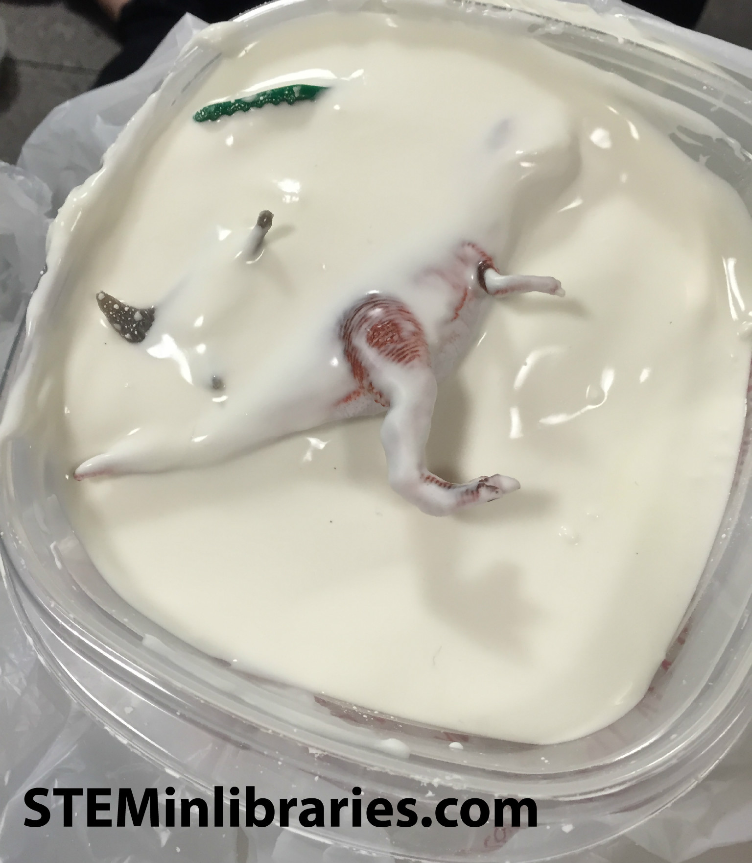 When the Oobleck has harden, make a fresh batch of Oobleck and use it to completely cover the dinosaurs. Set out to dry. Depending on how much Oobleck there is in the containers to dry, it can take anywhere from 4 hours to 2 days to dry.