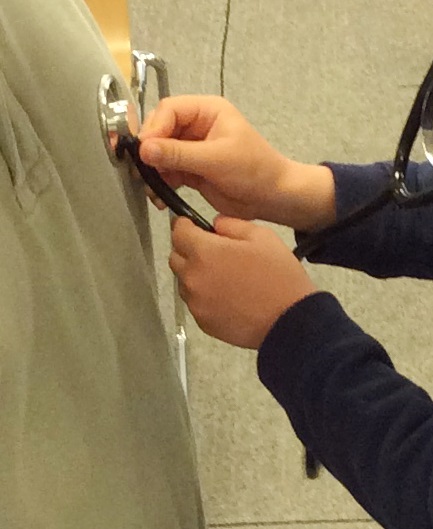 Originally, we were going to make stethoscope crafts, but decided it was too complicated since we had real stethoscopes on hand. We just put out stethoscopes on a table with a sign instructing them to listen to their heartbeat, do jumping jacks, and then listen again.