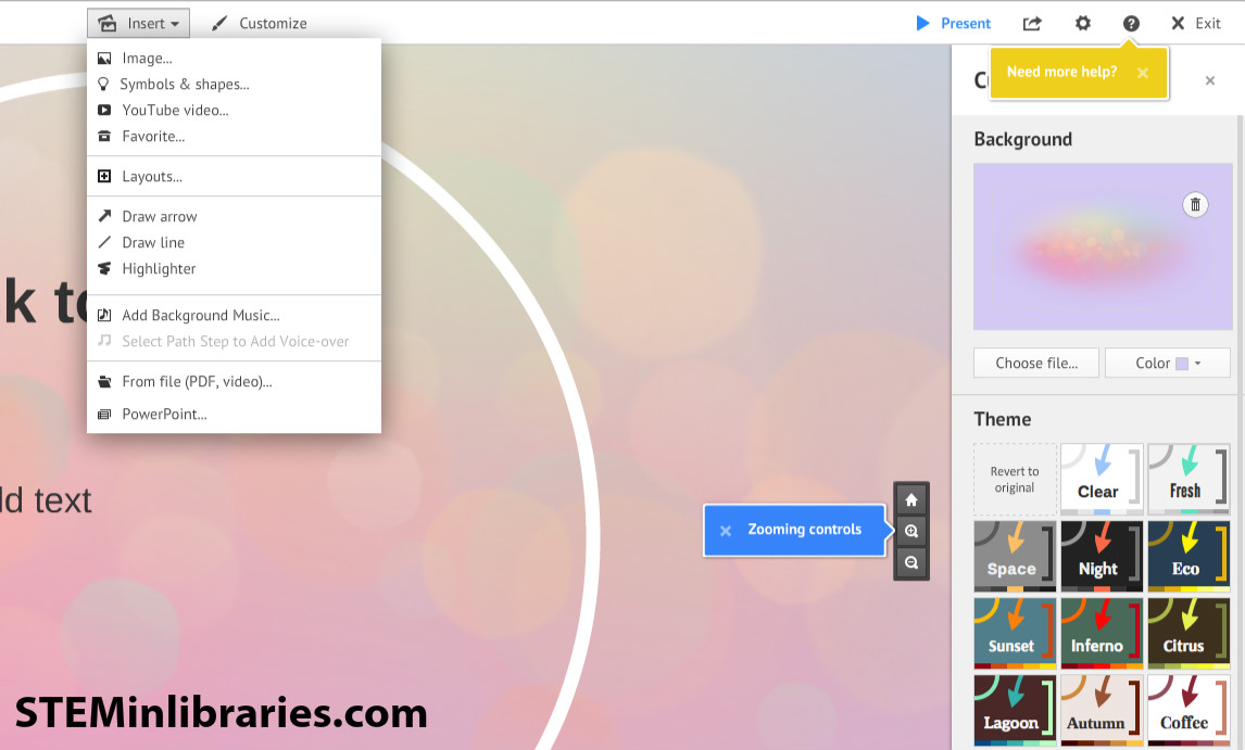 With the frames, we showed how to insert images. As Prezi allows users to pull images from a Google search, we used this as a teaching moment to explain about copyright, and how to properly credit sources. We also directed participants to some of our databases that offer images to use.