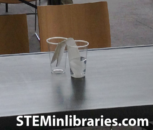 We broke participants up in groups of four and had them set up the following two experiments: Escaping Water from Sciencekids.co.nz and Walking Water on Playbasedlearning.com.au. We used books as risers for the Walking Water on Playbasedlearning.com.au experiment. As with the puddle experiment, we checked on the progress of the experiments periodically for the rest of the program.