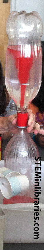 We used both the Soda Bottle Tornado on Stevespanglerscience.com and the Tornado in a Bottle on Stevespanglerscience.com as resources for our demonstration. It was exceedingly successful with the kids. They thoroughly enjoyed watching the tornado form, and wanted us to demonstrate it again and again, as well as try it themselves. After the program, the kids eagerly pulled their parents to the tornado experiment to show them.